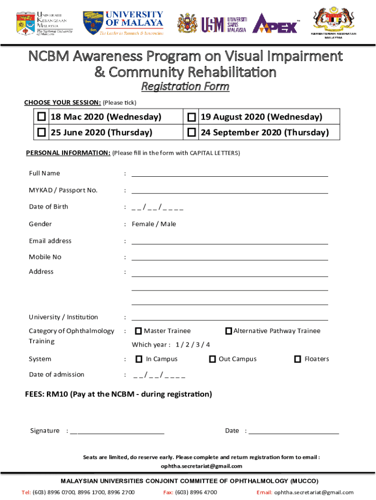 NCBM Awareness Program on Visual Impairment & Community Rehabilitation Registration Form CHOOSE YOUR SESSION: (Please tick)18 Mac 2020 (Wednesday)19 August 2020 (Wednesday)25 June 2020 (Thursday)24