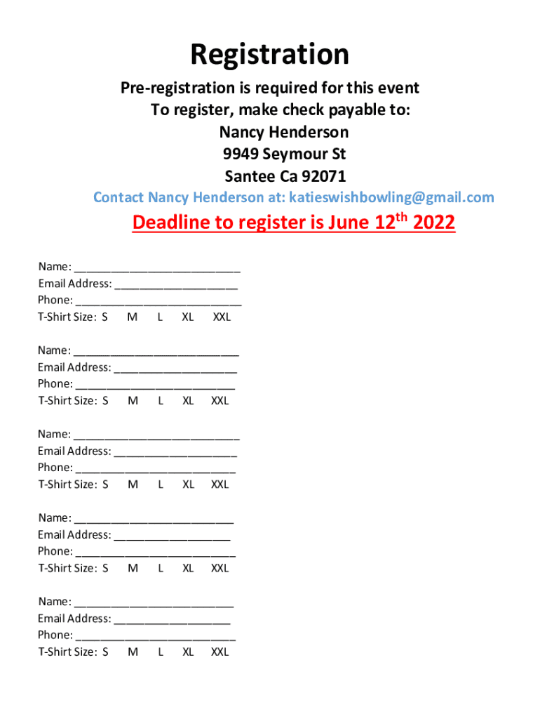 Registration Preregistration is required for this event To register, make check payable to: Nancy Henderson 9949 Seymour St Santee Ca 92071 Contact Nancy Henderson at: katieswishbowling@gmail.comDeadline