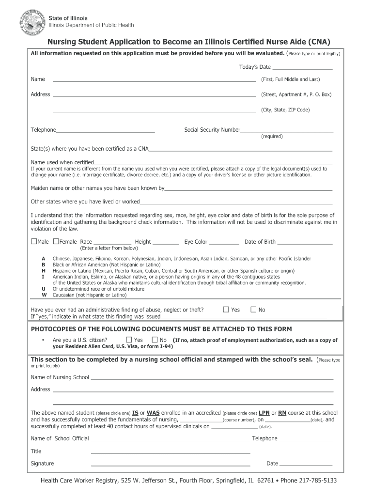 State of Illinois Department of Public Health Nursing Student Application to Become an Illinois Certified Nurse Aide (CNA) All information requested on this application must be provided before you