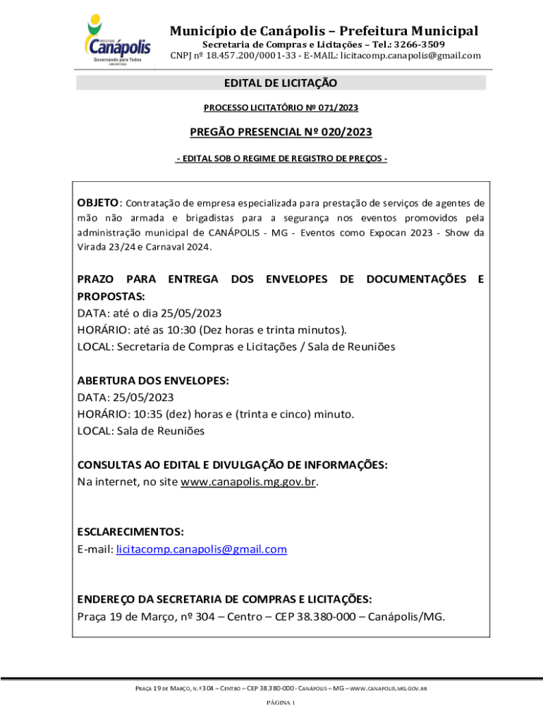Municpio de Canpolis Prefeitura Municipal Secretaria de Compras e Licitaes Tel.: 32663509 CNPJ n 18.457.200/000133 EMAIL: licitacomp.canapolis@gmail.comEDITAL DE LICITAO PROCESSO LICITATRIO N 071/2023PREGO