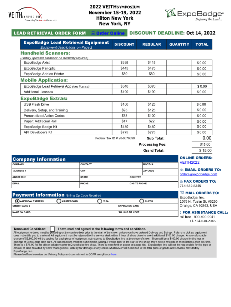 2022 VEITHSYMPOSIUM November 1519, 2022 Hilton New York New York, NY LEAD RETRIEVAL ORDER FORM Order OnlineExpoBadge Lead Retrieval EquipmentDISCOUNT DEADLINE: Oct 14, 2022DISCOUNTREGULARExpoBadge