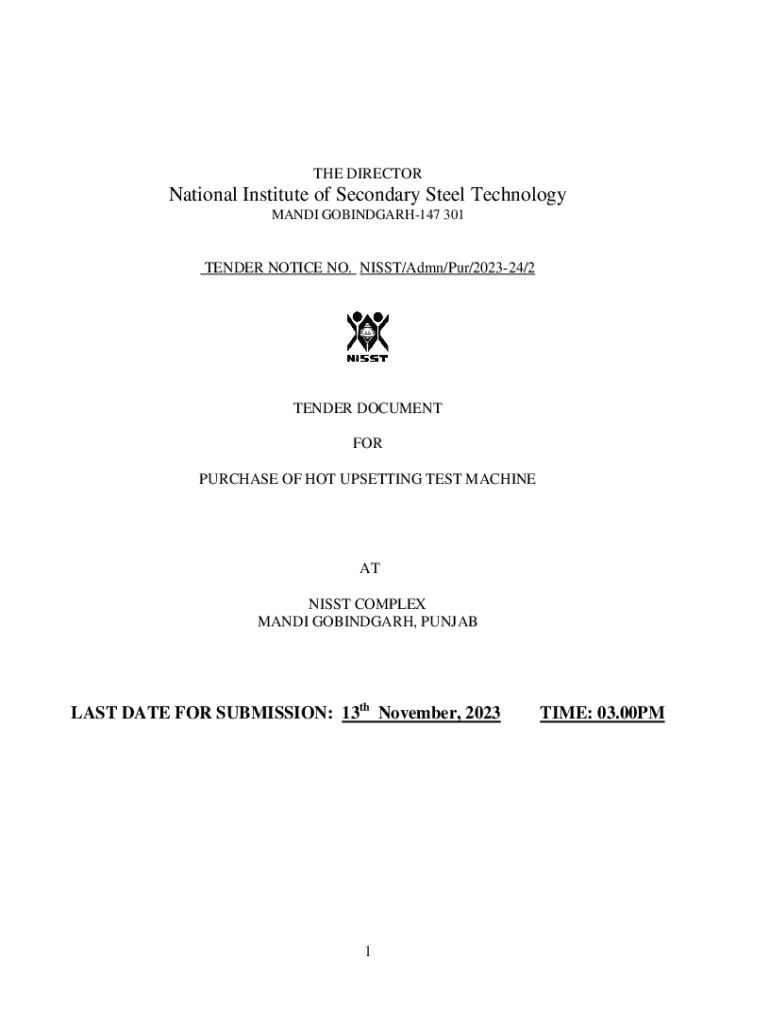 THE DIRECTORNational Institute of Secondary Steel Technology MANDI GOBINDGARH147 301TENDER NOTICE NO. NISST/Admn/Pur/202324/2TENDER DOCUMENT FOR PURCHASE OF HOT UPSETTING TEST MACHINEAT NISST COMPLEX