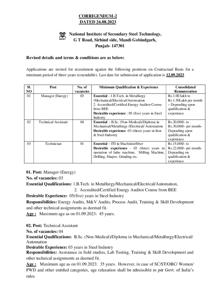 CORRIGENDUM2 DATED 26.08.2023 National Institute of Secondary Steel Technology, G T Road, Sirhind side, Mandi Gobindgarh, Punjab 147301 Revised details and terms & conditions are as below: Applications