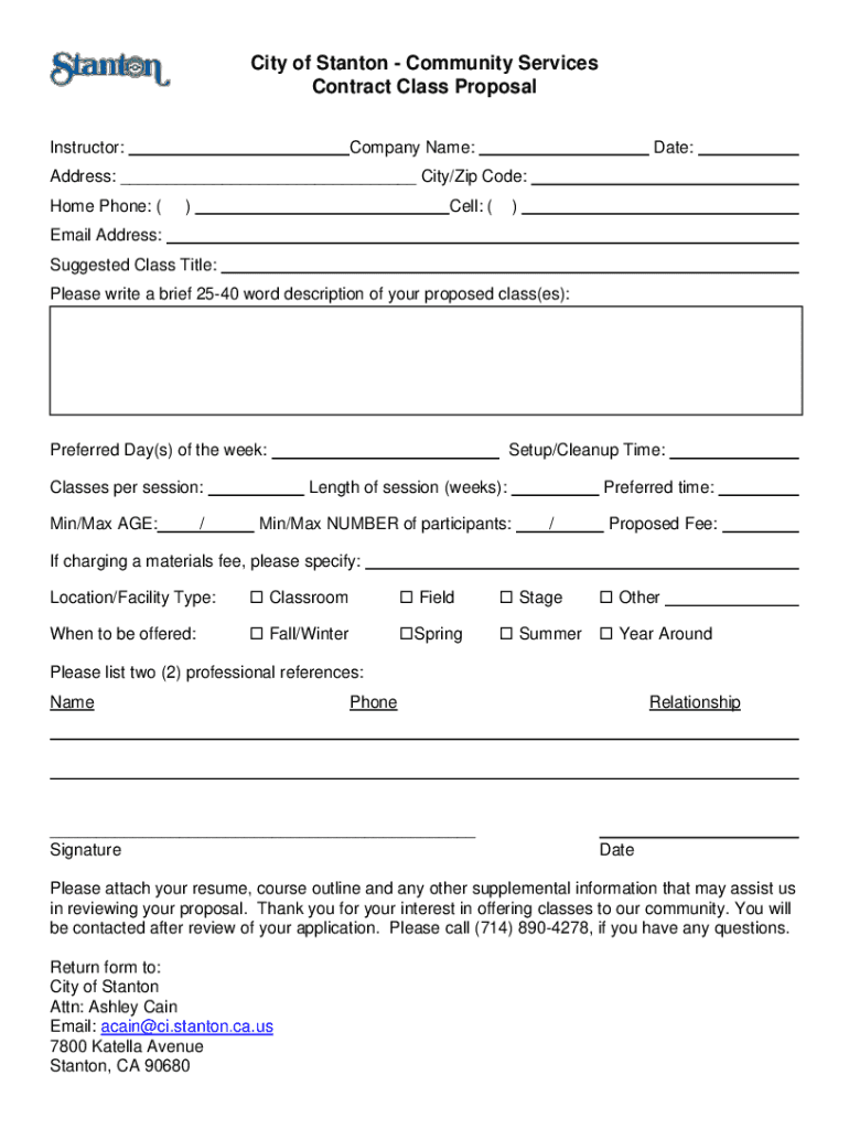 City of Stanton Community Services Contract Class Proposal Instructor:Company Name:Date:Address: ___ City/Zip Code: Home Phone: ()Cell: ()Email Address: Suggested Class Title: Please write a brief