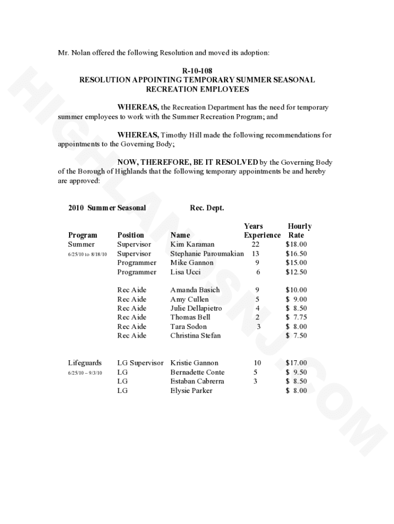 summer employees to work with the Summer Recreation Program; andIGHR10108