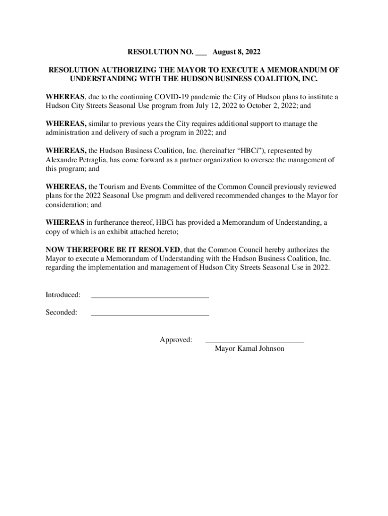 RESOLUTION NO. ___ August 8, 2022 RESOLUTION AUTHORIZING THE MAYOR TO EXECUTE A MEMORANDUM OF UNDERSTANDING WITH THE HUDSON BUSINESS COALITION, INC. WHEREAS, due to the continuing COVID19 pandemic