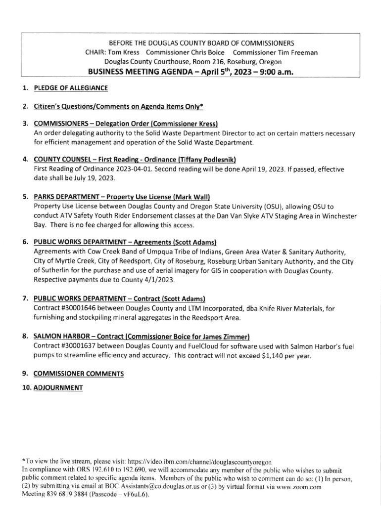 Douglas County Courthouse, Room 216, Roseburg, OregonCHAIR: Compress CommissionerBUSINESS MEETING AGENDA April