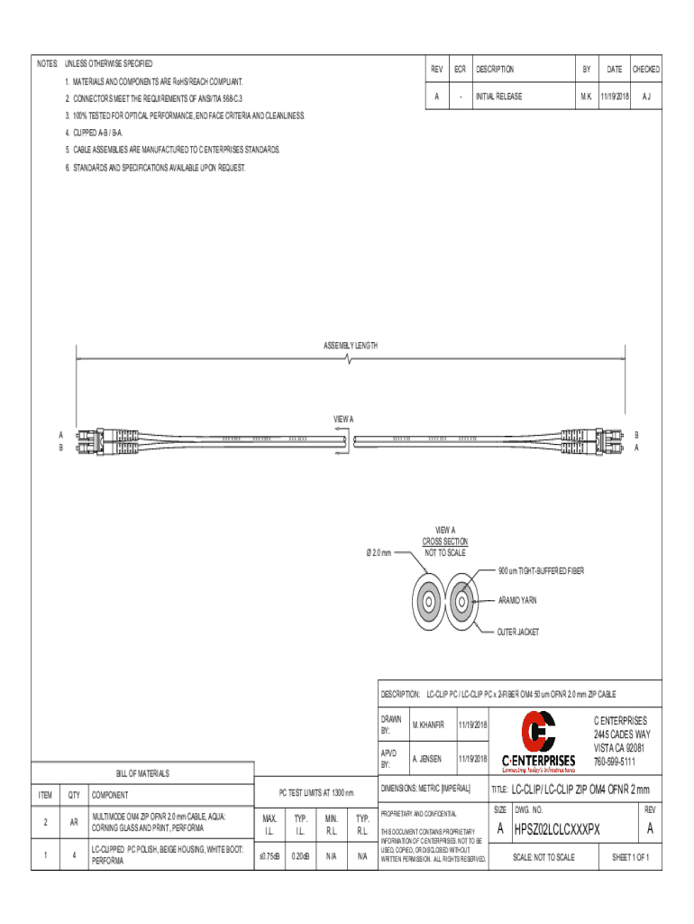 NOTES:UNLESS OTHERWISE SPECIFIEDREVECRADESCRIPTIONBYDATECHECKEDM.K.11/19/2018A.J1. MATERIALS AND COMPONENTS ARE RoHS/REACH COMPLIANT. 2. CONNECTORS MEET THE REQUIREMENTS OF ANSI/TIA 568C.3INITIAL