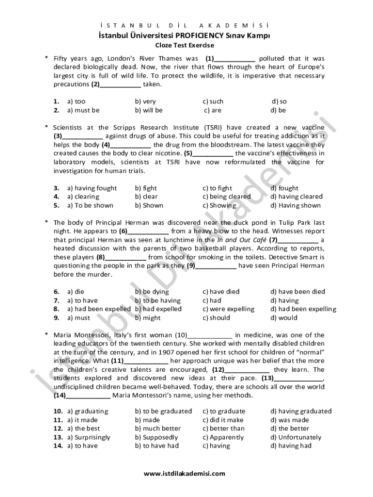 STANBULDLAKADEMSstanbul niversitesi PROFICIENCY Snav KampCloze Test Exercise*Fiftyyearsago,LondonsRiverThameswas(1)___pollutedthatitwasdeclaredbiologicallydead.Now,theriverthatflowsthroughtheheartofEuropeslargestcityisfullofwildlife.Toprotectthewildlife,itisimperativethatnecessaryprecautions