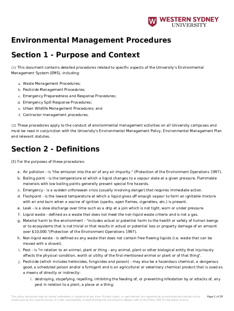 Environmental Management Procedures Section 1 Purpose and Context (1) This document contains detailed procedures related to specific aspects of the University\'s Environmental Management System (EMS),