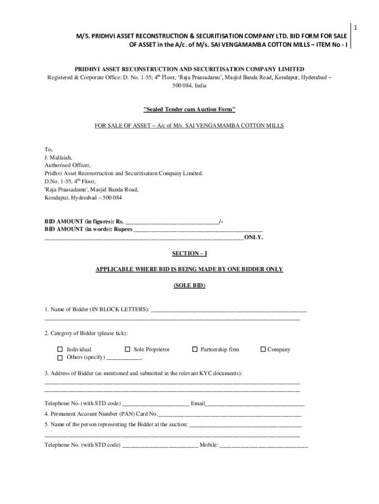 1 M/S. PRIDHVI ASSET RECONSTRUCTION & SECURITISATION COMPANY LTD. BID FORM FOR SALE OF ASSET in the A/c. of M/s. SAI VENGAMAMBA COTTON MILLS ITEM No IPRIDHVI ASSET RECONSTRUCTION AND SECURITISATION