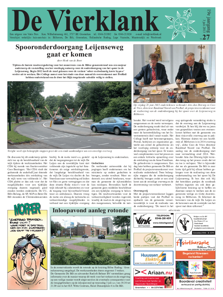 Nr.19e jaargang3 juli 2013Een uitgave van Vario Pers Kon. Wilhelminaweg 461, 3737 BE Groenekan tel. 0346211992 fax 0346213824 email info@vierklank.nl Verschijnt wekelijks huisaanhuis in: Bilthoven,