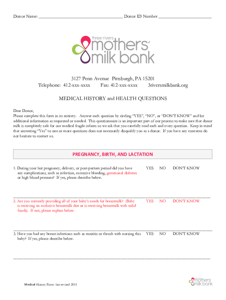 Donor Name: ___ Donor ID Number ___3127 Penn Avenue Pittsburgh, PA 15201 Telephone: 412xxxxxxx Fax: 412xxxxxxx 3riversmilkbank.org MEDICAL HISTORY and HEALTH QUESTIONS Dear Donor, Please complete