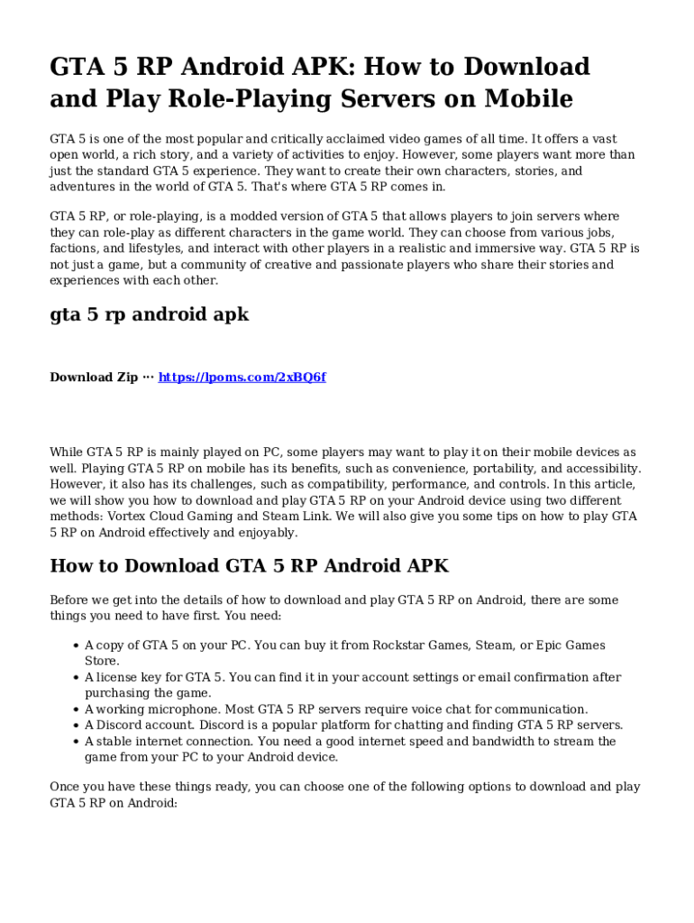 GTA 5 RP Android APK: How to Download and Play RolePlaying Servers on Mobile GTA 5 is one of the most popular and critically acclaimed video games of all time. It offers a vast open world, a rich