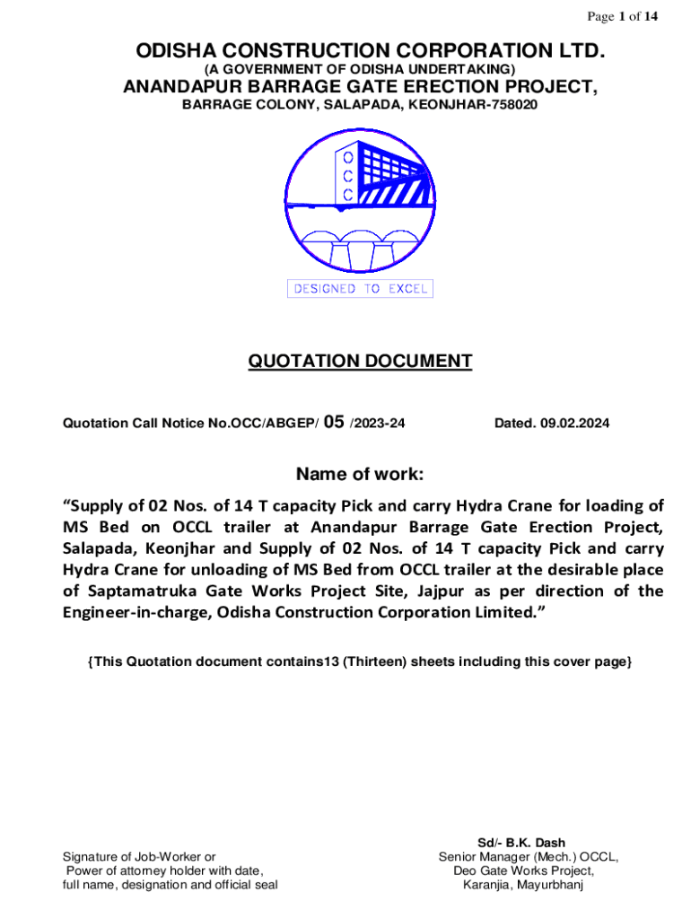 Page 1 of 14ODISHA CONSTRUCTION CORPORATION LTD. (A GOVERNMENT OF ODISHA UNDERTAKING)ANANDAPUR BARRAGE GATE ERECTION PROJECT, BARRAGE COLONY, SALAPADA, KEONJHAR758020QUOTATION DOCUMENTQuotation Call