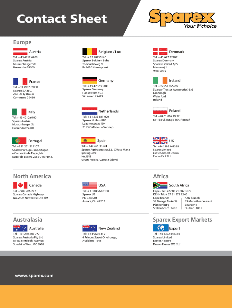 Contact Sheet Europe Austria Tel: + 43 4212 6400 Sparex Austria Muraunberger Str Hurzendorf 9300France Tel: +33 2987 89234 Sparex S.A.R.L. Zae De Ty Douar Commana 29450Italy Tel: + 43 4212 6400 Sparex