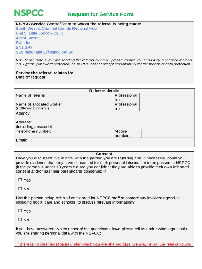The NSPCC Change for Good Referral is a writable document needed to be submitted to the relevant address to provide some information. It has to be completed and signed, which can be done manually in hard copy, or with a certain solution e. g. PDFfiller. This tool allows to complete any PDF or Word document directly in your browser, customize it according to your requirements and put a legally-binding electronic signature. Right after completion, the user can send the NSPCC Change for Good Referral to the relevant recipient, or multiple recipients via email or fax. The editable template is printable too because of PDFfiller feature and options offered for printing out adjustment. In both electronic and physical appearance, your form will have got organized and professional appearance. You can also turn it into a template to use later, there's no need to create a new file from scratch. All that needed is to customize the ready document.
