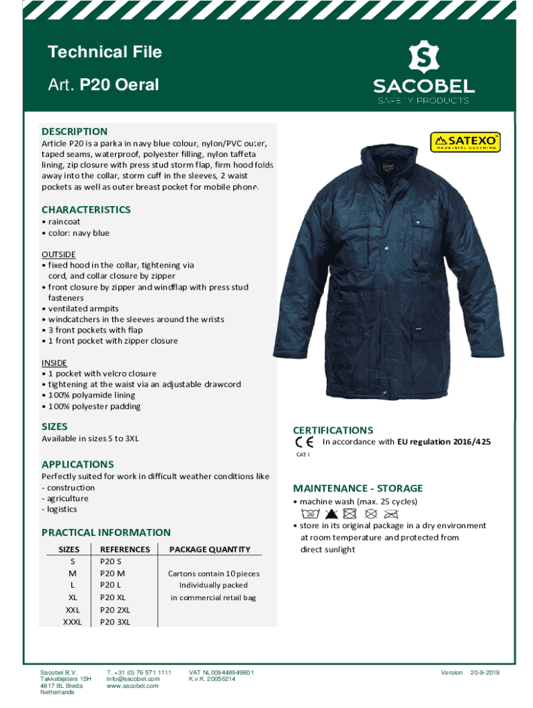 Technical File Art. P20 Oeral DESCRIPTION Article P20 is a parka in navy blue colour, nylon/PVC outer, taped seams, waterproof, polyester filling, nylon taffeta lining, zip closure with press stud