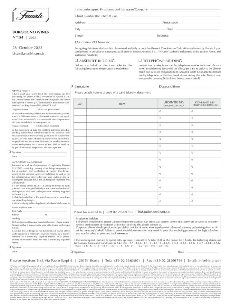 I, the undersigned First name and last name/Company Client number (for internal use) AddressBORGOGNO WINES N154 | 2022Postal codeCityEmailStatoTelefonoTAX Code VAT Number28 October 2022by signing