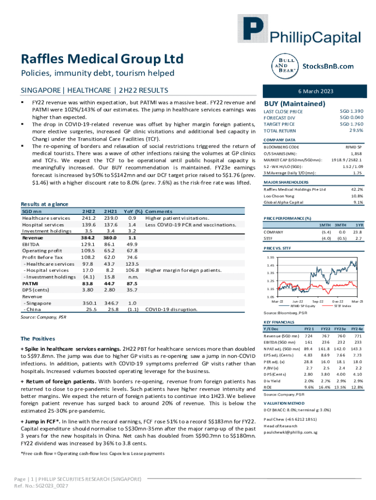 Raffles Medical Group Ltd Policies, immunity debt, tourism helped SINGAPORE | HEALTHCARE | 2H22 RESULTS FY22 revenue was within expectation, but PATTI was a massive beat. FY22 revenue and PATTI were