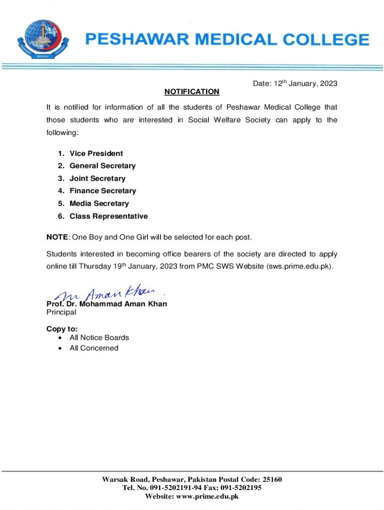 Date: 12th January 2023 NOTIFICATION It is notified for information of all the students of Peshawar Medical College that those students who are interested in Social Welfare Society can apply to the