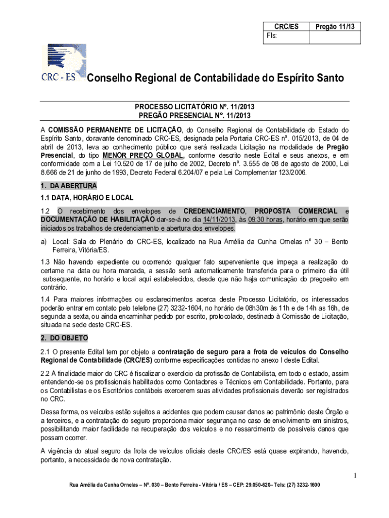 CRC/ES Fls:Prego 11/13Conselho Regional de Contabilidade do Esprito Santo PROCESSO LICITATRIO N. 11/2013 PREGO PRESENCIAL N. 11/2013 A COMISSO PERMANENTE DE LICITAO, do Conselho Regional de Contabilidade