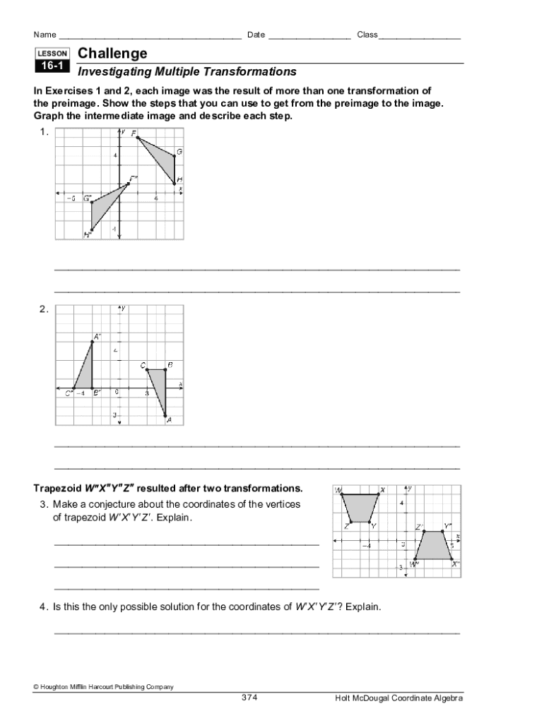 Name ___ Date ___ Class___ LESSON161Challenge Investigating Multiple TransformationsIn Exercises 1 and 2, each image was the result of more than one transformation of the preimage. Show the steps