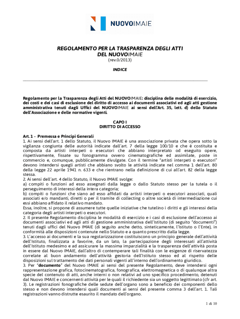 REGOLAMENTO PER LA TRASPARENZA DEGLI ATTI DEL NUOVOIMAIE (rev.0/2013) INDICE ___Regolamento per la Trasparenza degli Atti del NUOVOIMAIE: disciplina delle modalit di esercizio, dei costi e dei casi