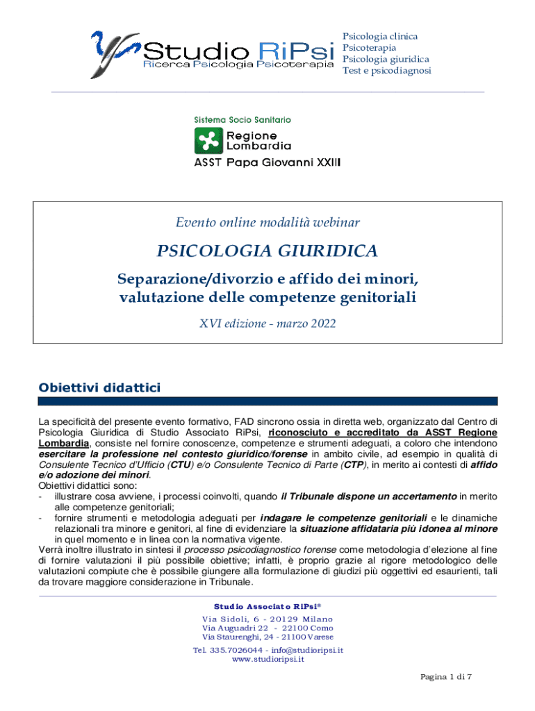 Psicologia clinica Psicoterapia Psicologia giuridica Test e psicodiagnosi ___Evento online modalit webinarPSICOLOGIA GIURIDICA Separazione/divorzio e affido dei minori, valutazione delle competenze