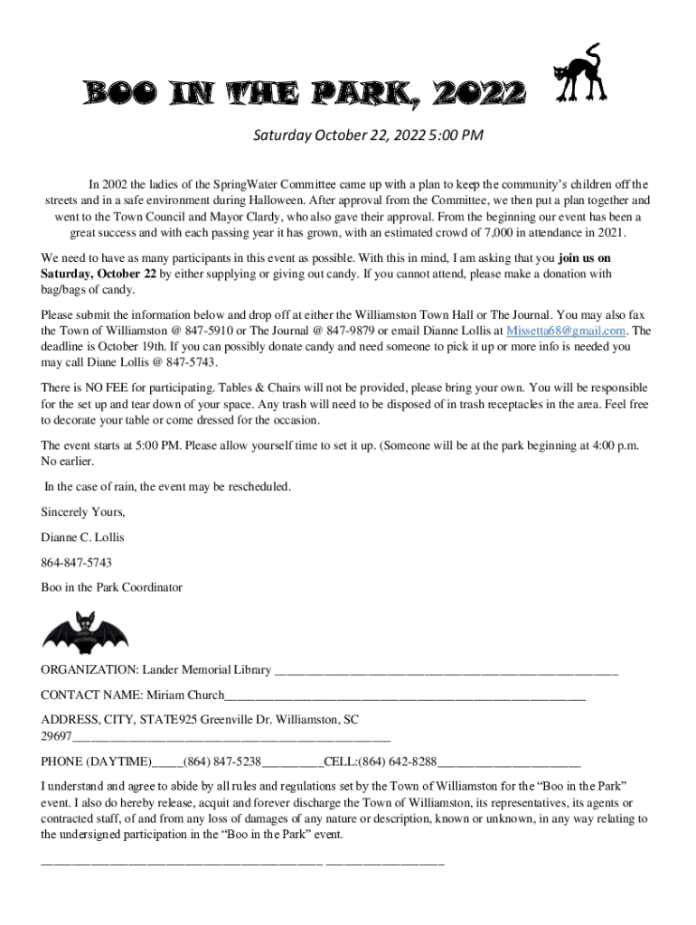 BOO IN THE PARK, 2022 Saturday October 22, 2022 5:00 PM In 2002 the ladies of the SpringWater Committee came up with a plan to keep the communitys children off the streets and in a safe environment