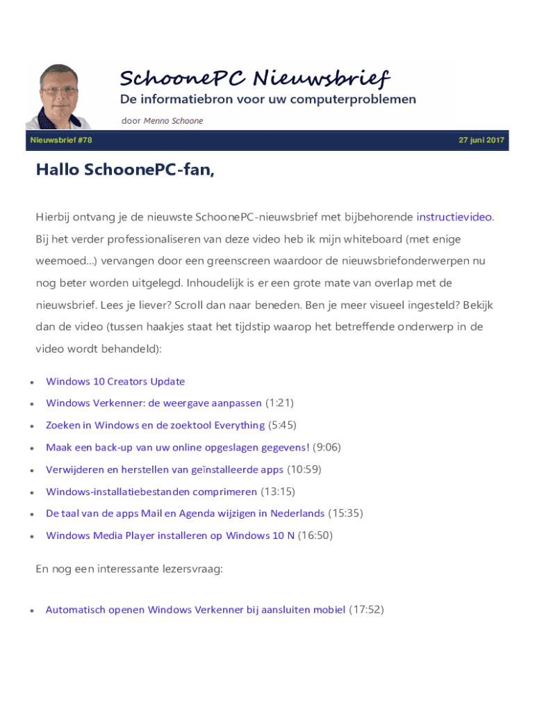 Nieuwsbrief #7827 juni 2017Hallo SchoonePCfan, Hierbij ontvang je de nieuwste SchoonePCnieuwsbrief met bijbehorende instructievideo. Bij het verder professionaliseren van deze video heb ik mijn whiteboard