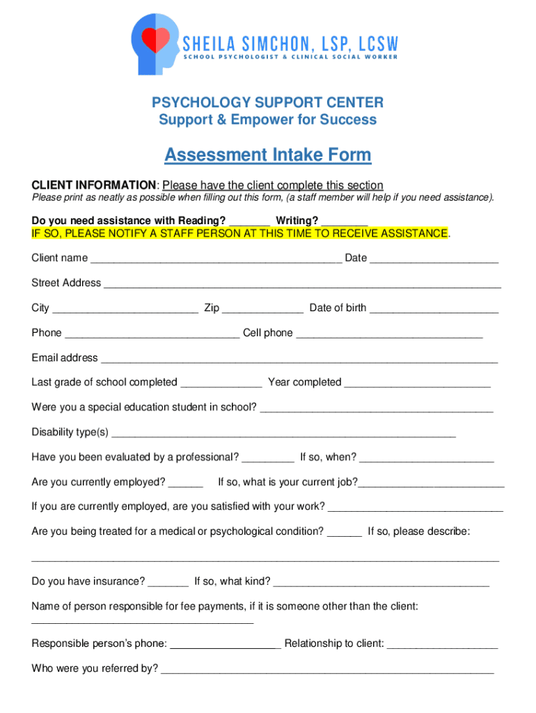 Get the Psychology Intake Form & TemplateFree PDF Download