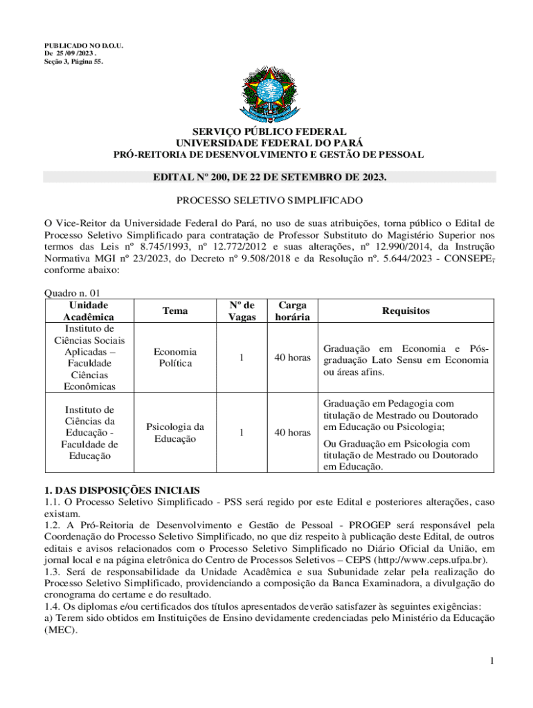 PUBLICADO NO D.O.U. De 25 /09 /2023 . Seo 3, Pgina 55.SERVIO PBLICO FEDERAL UNIVERSIDADE FEDERAL DO PAR PRREITORIA DE DESENVOLVIMENTO E GESTO DE PESSOALEDITAL N 200, DE 22 DE SETEMBRO DE 2023. PROCESSO