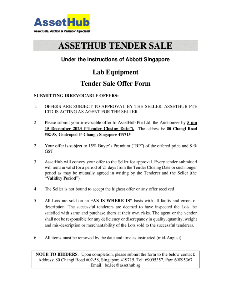 AssetHub Asset Sale, Auction & Valuation SpecialistASSETHUB TENDER SALE Under the Instructions of Abbott SingaporeLab Equipment Tender Sale Offer Form SUBMITTING IRREVOCABLE OFFERS: 1.OFFERS ARE SUBJECT