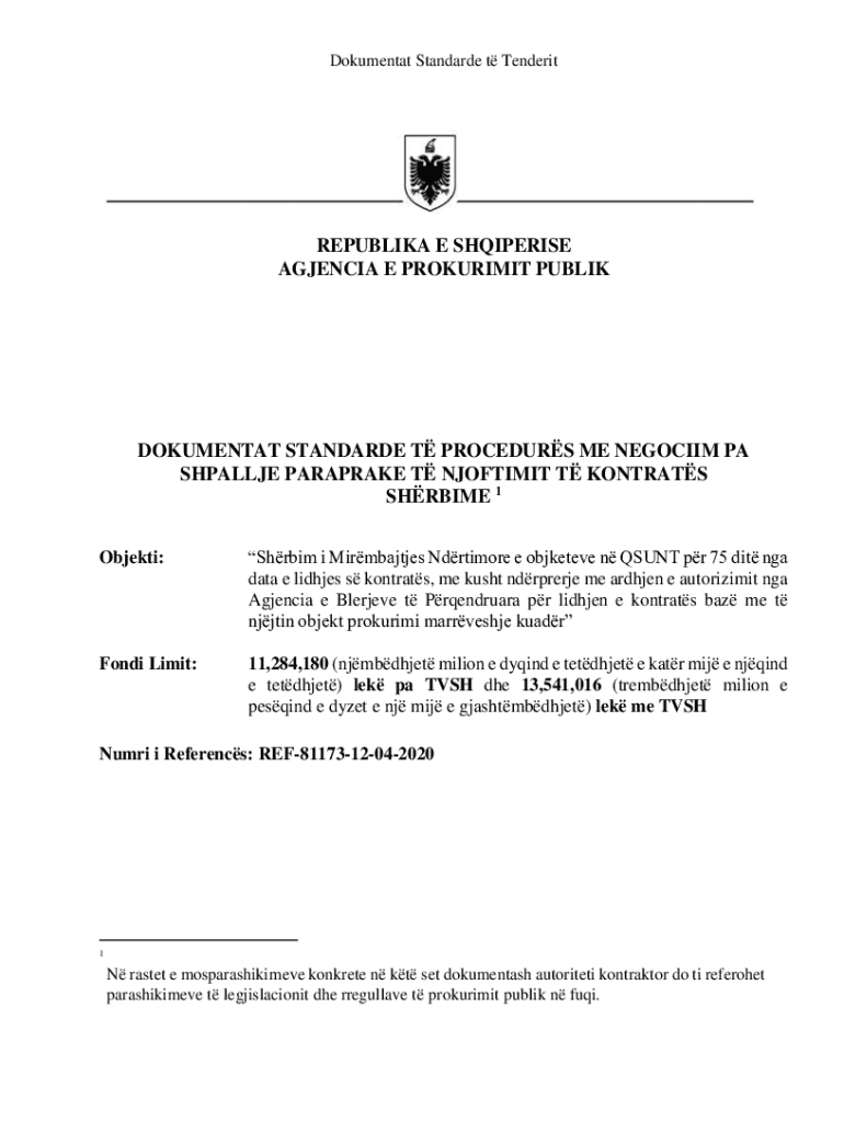Dokumentat Standarde t TenderitREPUBLIKA E SHQIPERISE AGJENCIA E PROKURIMIT PUBLIKDOKUMENTAT STANDARDE T PROCEDURS ME NEGOCIIM PA SHPALLJE PARAPRAKE T NJOFTIMIT T KONTRATS SHRBIME 1 Objekti:Shrbim