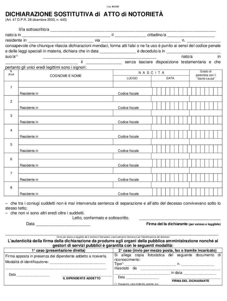 Cod. N 0101DICHIARAZIONE SOSTITUTIVA di ATTO di NOTORIET (Art. 47 D.P.R. 28 dicembre 2000, n. 445)Il/la sottoscritto/a ___ nato/a in ___ il ___ cittadino/a ___ residente in ___ via ___ n. ___ consapevole