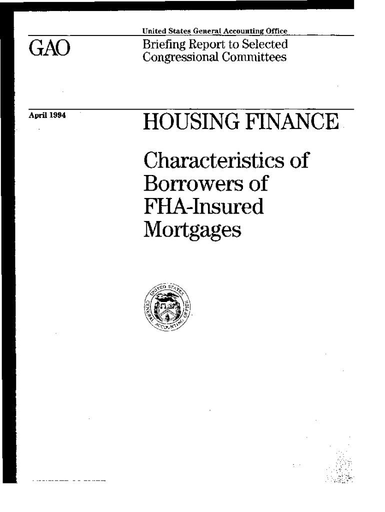 UnitedStates GeneralAccountingOfficeGAOBriefing Report to Selected Congressional CommitteesAprilHOUSING FINANCE1994Characteristics of Borrowers of FHAInsured Mortgages___GAOUnited States General Accounting