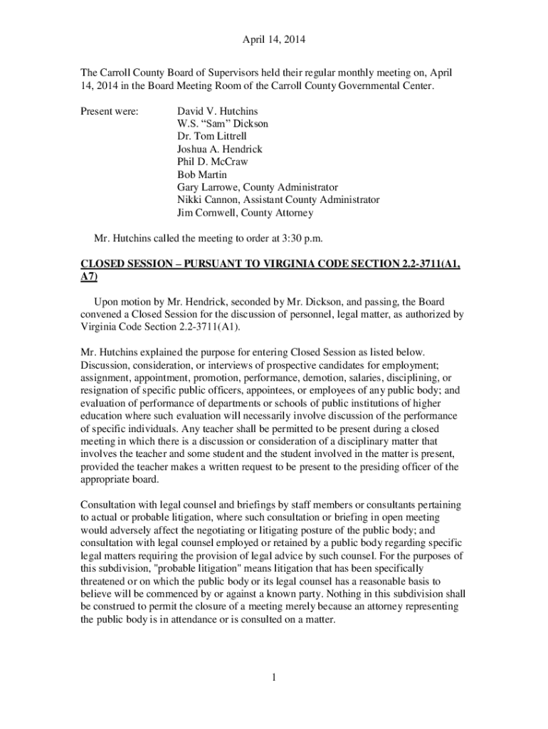 14, 2014, in the Board Meeting Room of the Carroll County Governmental Center.