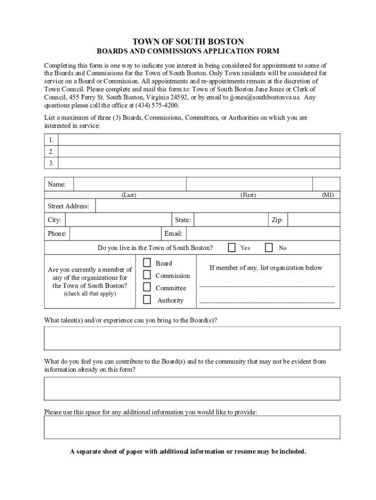 TOWN OF SOUTH BOSTONBOARDS AND COMMISSIONS APPLICATION FORM Completing this form is one way to indicate you interest in being considered for appointment to some of the Boards and Commissions for the