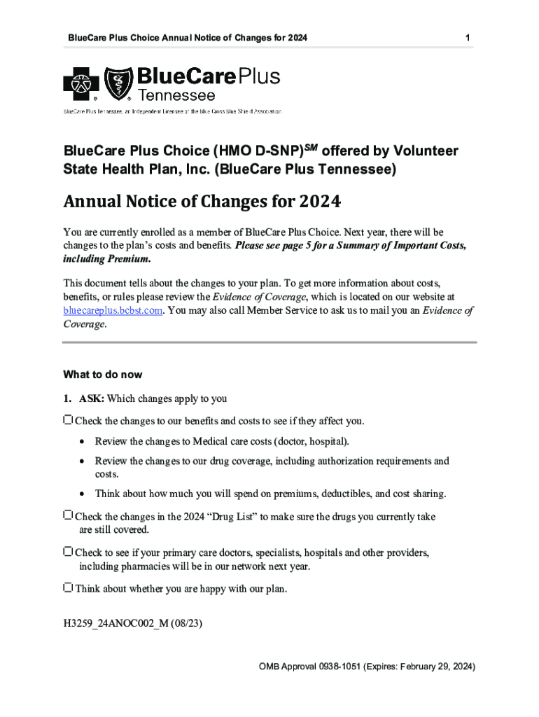 Bluesier Plus Choice Annual Notice of Changes for 20241BlueCare Plus Choice (HMO DSP)SM offered by Volunteer