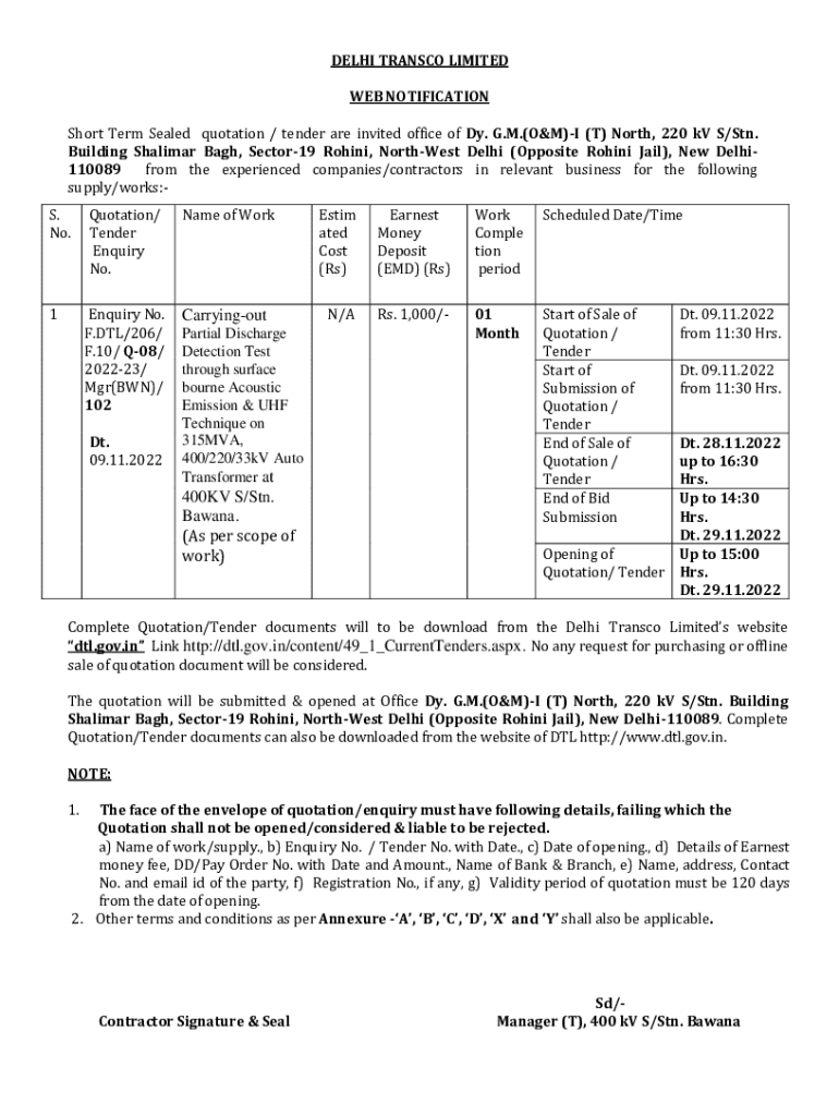 DELHI TRANSCO LIMITED WEB NOTIFICATION Short Term Sealed quotation / tender are invited office of Dy. G.M.(O&M)I (T) North, 220 kV S/Stn. Building Shalimar Bagh, Sector19 Rohini, NorthWest Delhi (Opposite