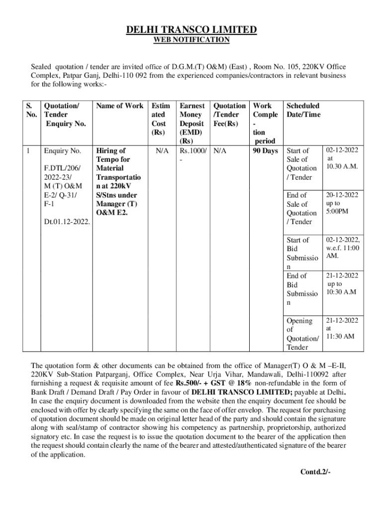 WEB NOTIFICATIONSealed quotation / tender are invited office of D.G.M.(T) O&M) (East), Room No. 105, 220KV Office