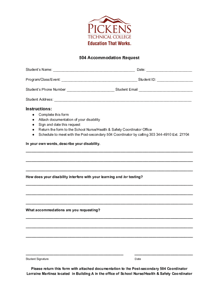 504 Accommodation Request Students Name: ___ Date: ___ Program/Class/Event: ___ Student ID: ___ Students Phone Number ___ Student Email ___ Student Address: ___Instructions: Complete this form Attach