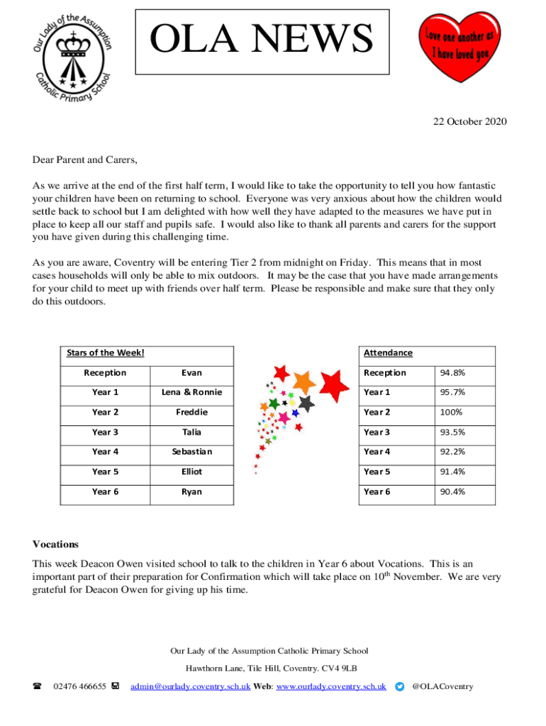 OLA NEWS 22 October 2020Dear Parent and Carers, As we arrive at the end of the first half term, I would like to take the opportunity to tell you how fantastic your children have been on returning