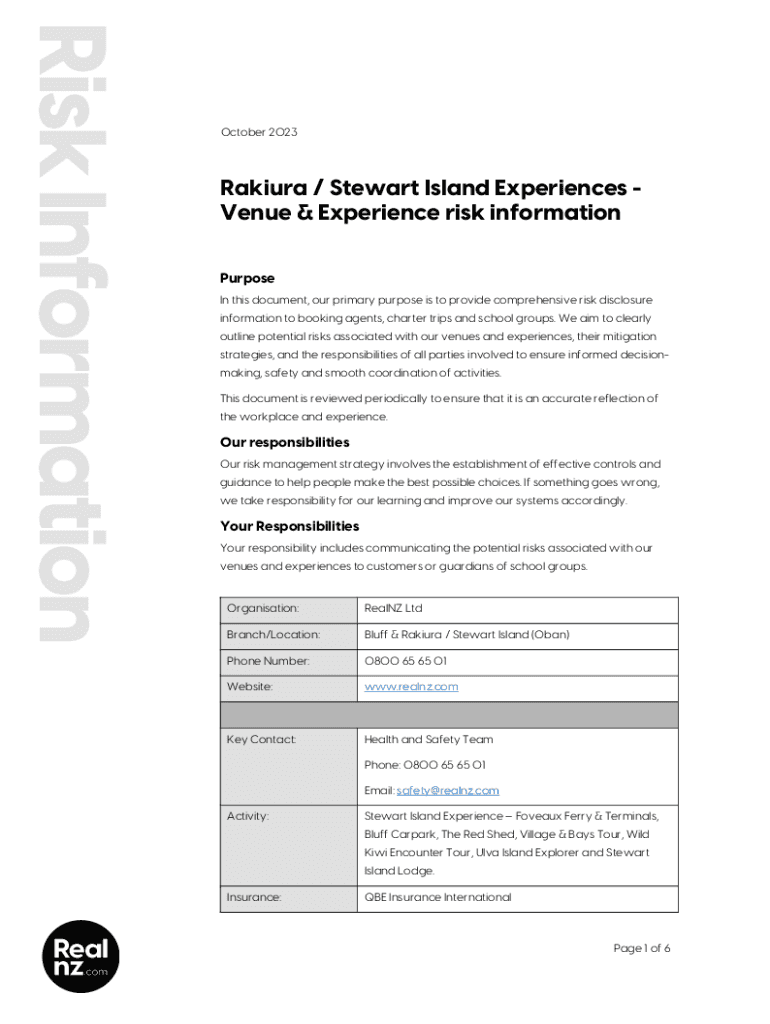 October 2023Rakiura / Stewart Island Experiences Venue & Experience risk information Purpose In this document, our primary purpose is to provide comprehensive risk disclosure information to booking