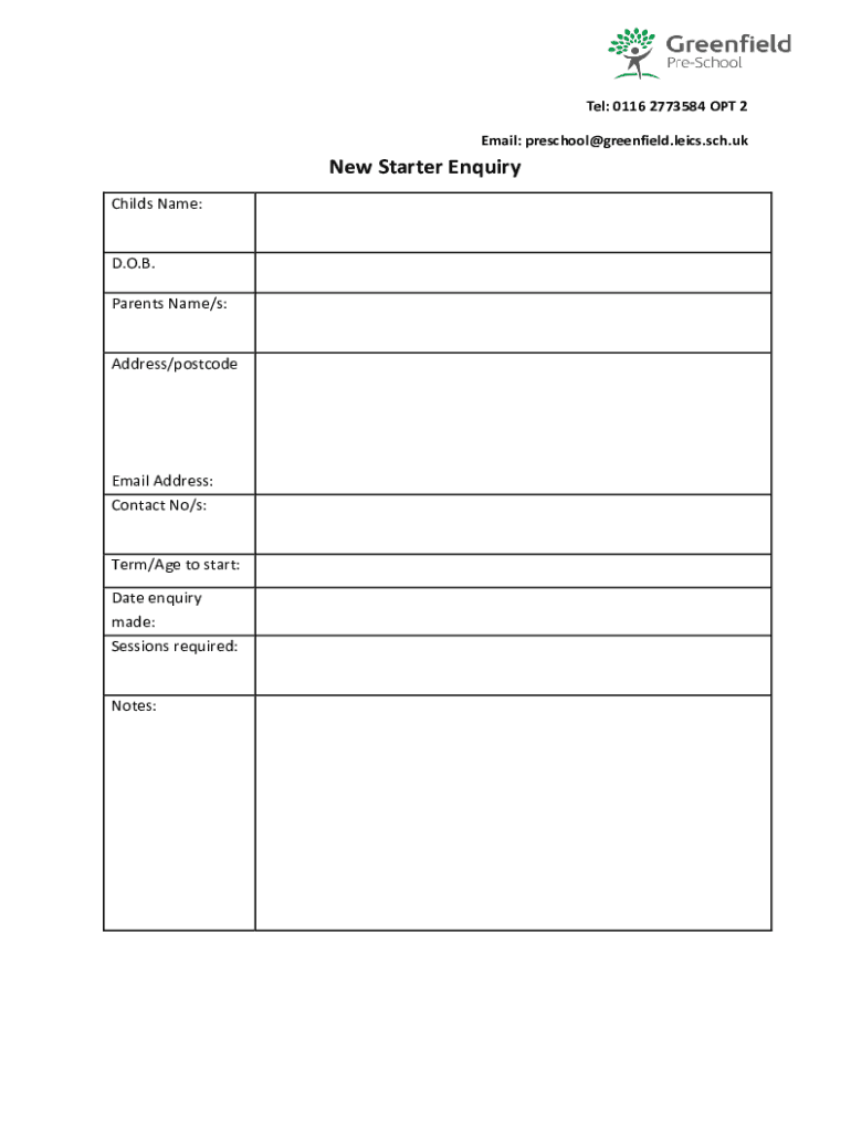 Tel: 0116 2773584 OPT 2 Email: preschool@greenfield.leics.sch.ukNew Starter Enquiry Childs Name:D.O.B. Parents Name/s:Address/postcodeEmail Address: Contact No/s:Term/Age to start: Date enquiry made:
