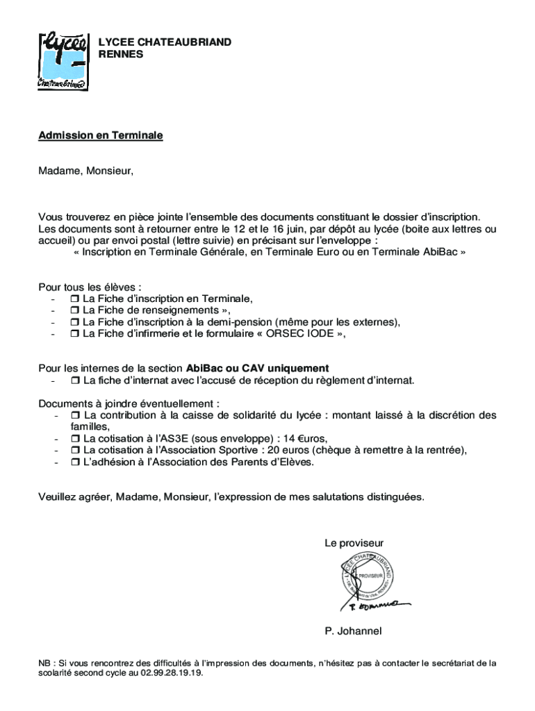 RENNESAdmission en TerminaleMadame, Monsieur, Vous trouvère en nice joint ensemble DES documents constituent LE dossier inscription.