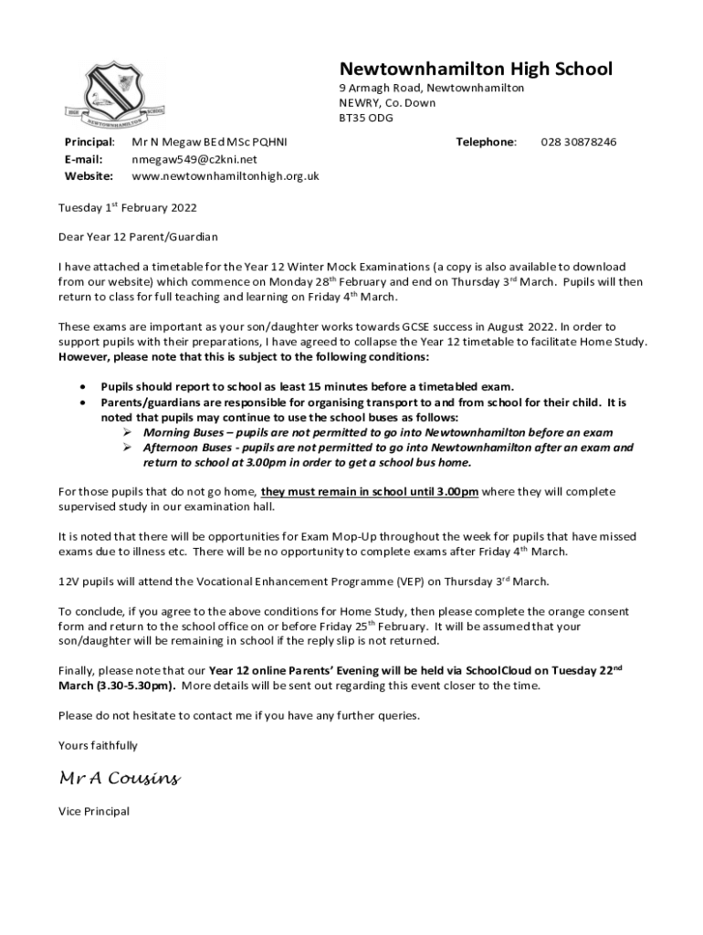 Typically, parents or guardians of students enrolled in Newtownhamilton High School are required to file relevant paperwork for student enrollment and school activities.