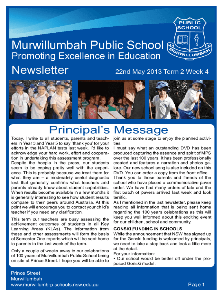 PUBLIC SCHOOLMurwillumbah Public School Promoting Excellence in EducationNewsletter22nd May 2013 Term 2 Week 4Principals MessageToday, I write to all students, parents and teachers in Year 3 and Year