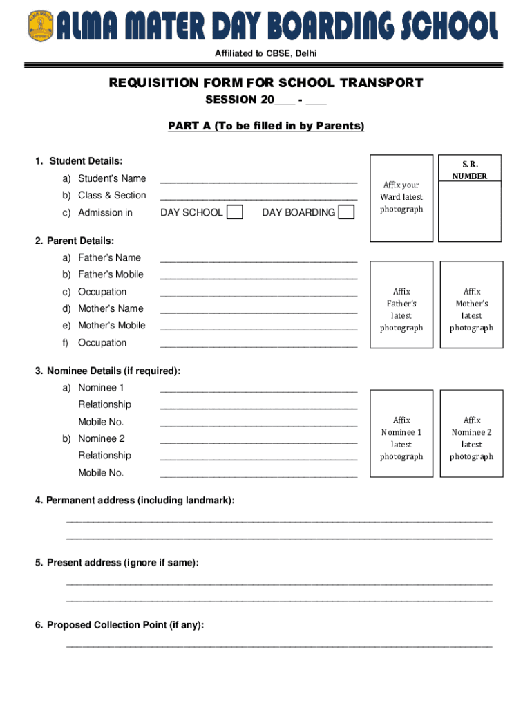 Affiliated to CBSE, DelhiREQUISITION FORM FOR SCHOOL TRANSPORT SESSION 20___ ___ PART A (To be filled in by Parents) 1. Student Details: a) Students Name___b) Class & Section___c) Admission inDAY